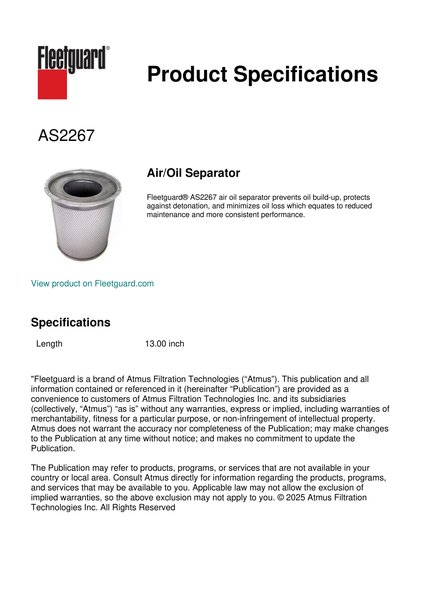 Fleetguard® AS2267 air oil separator prevents oil build-up, protects against detonation, and minimizes oil loss which equates to reduced maintenance and more consistent performance.Specification