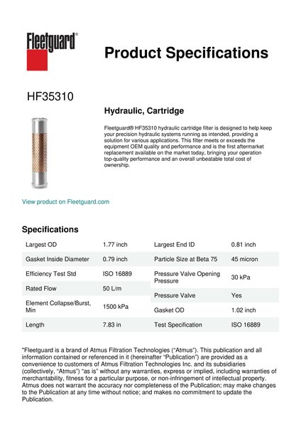 Fleetguard® HF35310 hydraulic cartridge filter is designed to help keep your precision hydraulic systems running as intended, providing a solution for various applications. This filter meets or exceeds the equipment OEM quality and performance and is the first aftermarket replacement available on the market today, bringing your operation top-quality performance and an overall unbeatable total cost of ownership.Specification