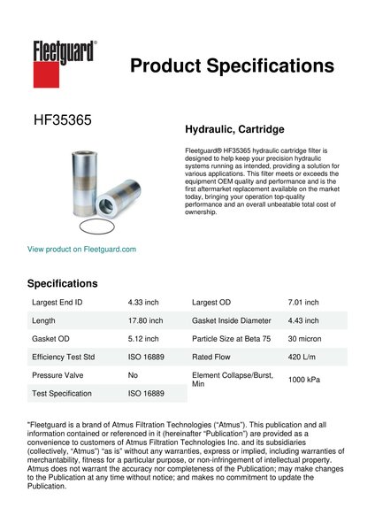 Fleetguard® HF35365 hydraulic cartridge filter is designed to help keep your precision hydraulic systems running as intended, providing a solution for various applications. This filter meets or exceeds the equipment OEM quality and performance and is the first aftermarket replacement available on the market today, bringing your operation top-quality performance and an overall unbeatable total cost of ownership.Specification