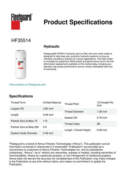 Fleetguard® HF35514 hydraulic spin-on filter with wire mesh media is designed to help keep your precision hydraulic systems running as intended, providing a solution for various applications. This filter meets or exceeds the equipment OEM quality and performance and is the first aftermarket replacement available on the market today, bringing your operation top-quality performance and an overall unbeatable total cost of ownership.Specification