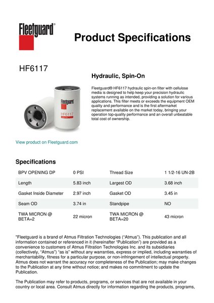 Fleetguard® HF6117 hydraulic spin-on filter with cellulose media is designed to help keep your precision hydraulic systems running as intended, providing a solution for various applications. This filter meets or exceeds the equipment OEM quality and performance and is the first aftermarket replacement available on the market today, bringing your operation top-quality performance and an overall unbeatable total cost of ownership.Specification