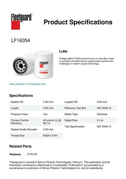Fleetguard® LF16354 premium spin-on lube filter meets or exceeds OE performance requirements and the new challenges of modern engine technology.Specification