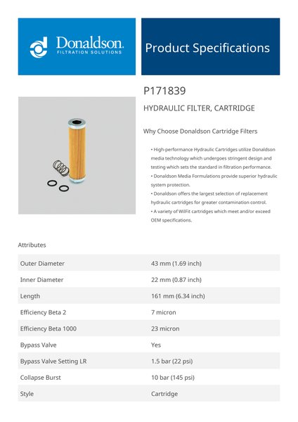 Genuine Donaldson P171839 Hydraulic Filter, Cartridge is designed to provide superior protection for your hydraulic system, effectively capturing contaminants to ensure clean fluid circulation. With high-quality filtration media, it extends equipment life, improves operational efficiency, and maintains fluid cleanliness even in the most demanding environments.