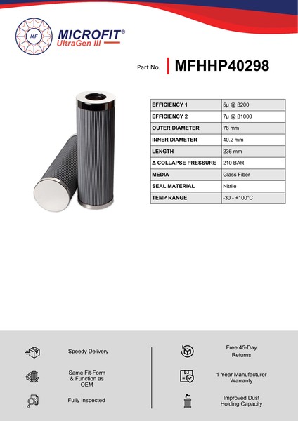 The efficiency of the element is shown using the Micron (µ) and Beta (β) ratings. The micron rating indicates the size of the particle being filtered and the beta rating the efficiency, calculated as 1/β.