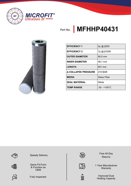Genuine MICROFIT® UltraGen III MFHHP40431 Pressure Filter. Engineered and manufactured in Great Britain the MFHHP40431 is designed to meet or exceed the quality and performance of OEM quality standards, ensuring superior filtration performance and the longest possible filter life.Building on over 50 years of filtration expertise, the UltraGen III series is the third generation of MICROFIT® filter media, delivering exceptional efficiency and reliability.
