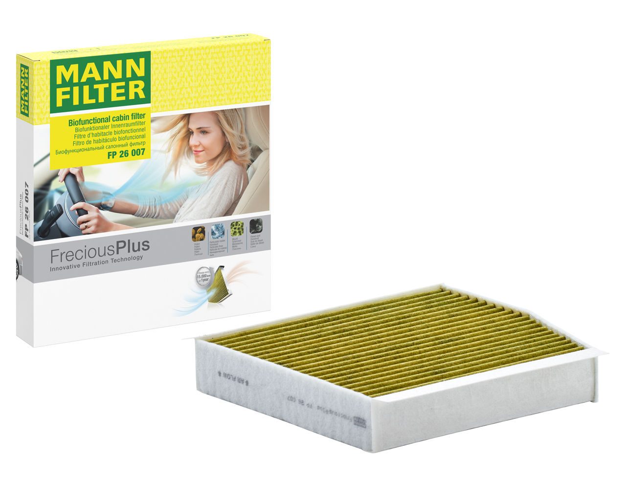Biofunctional MANN-FILTER FreciousPlus cabin air filters - nearly 100% protection against nitrogen oxides, dust, allergens and mould - harmful gases and unpleasant odours are also eliminated and virus aerosols filtered. The three-layer filter technology absorbs almost 100% of allergens, reduces the growth of molds and bacteria by more than 98% and stops fine dust almost completely.Specification